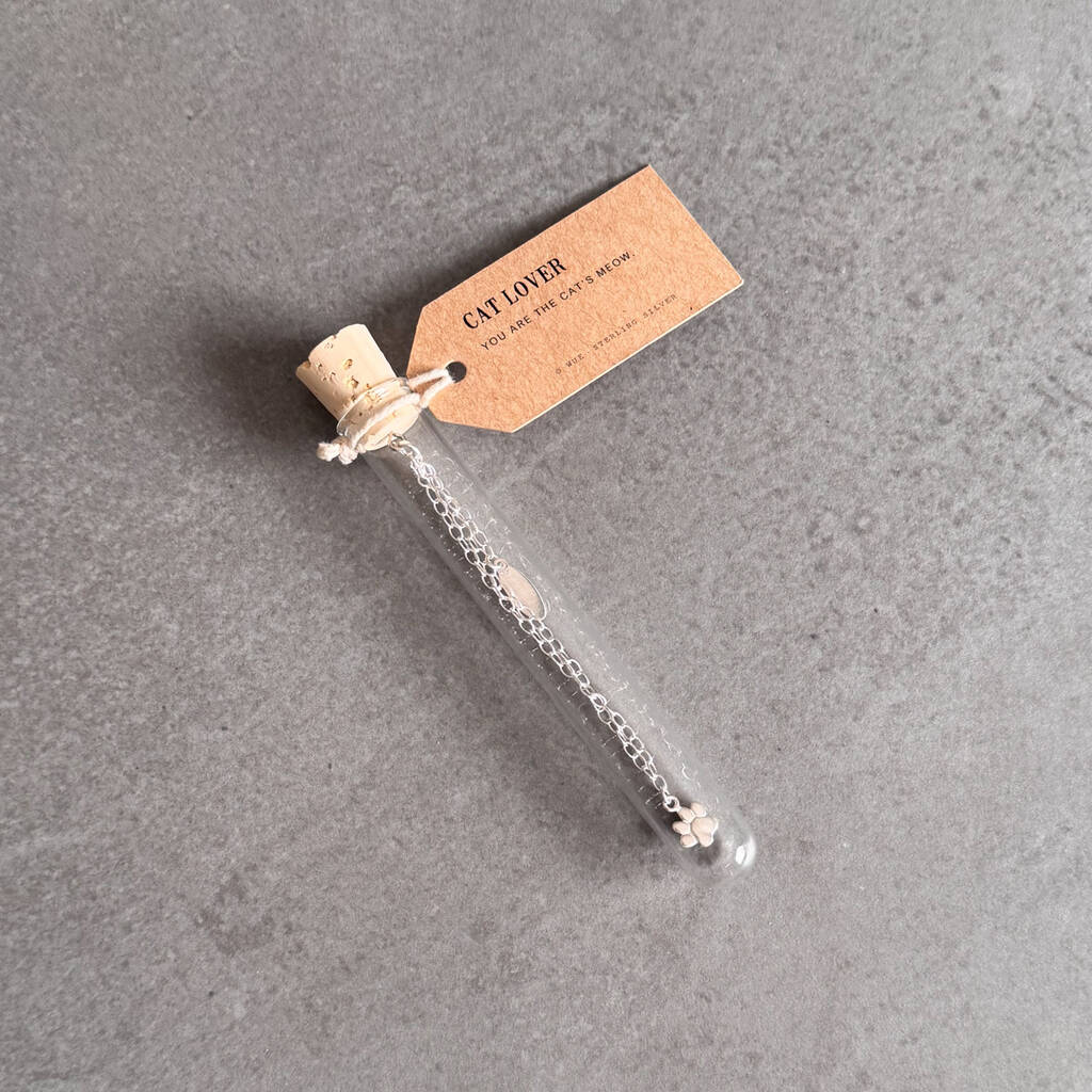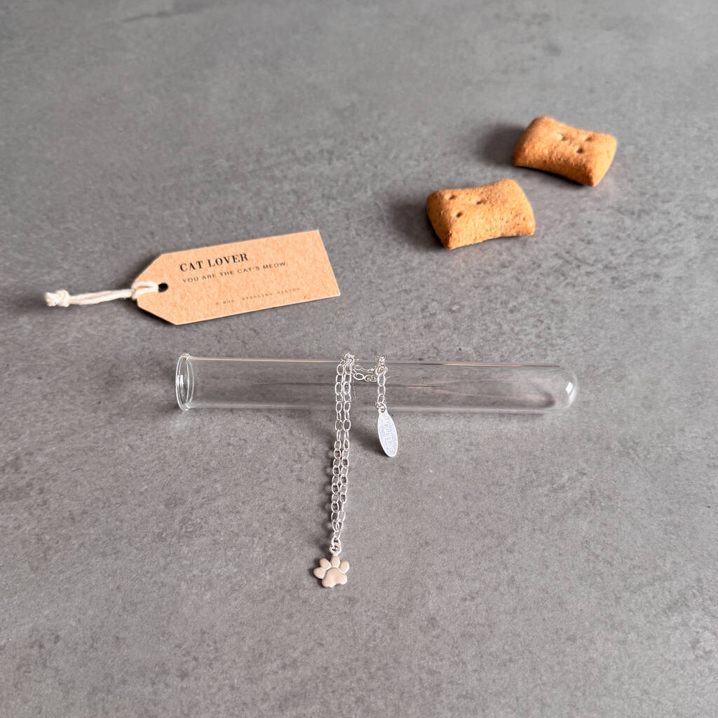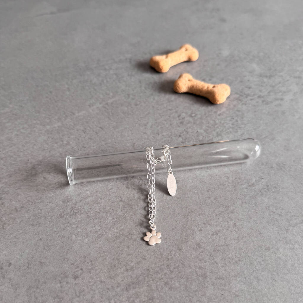 With a solid silver paw hanging from a delicate chain, this bracelet comes presented in a unique glass tube and your choice of message tags.