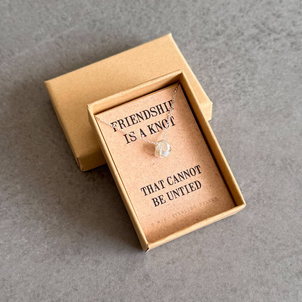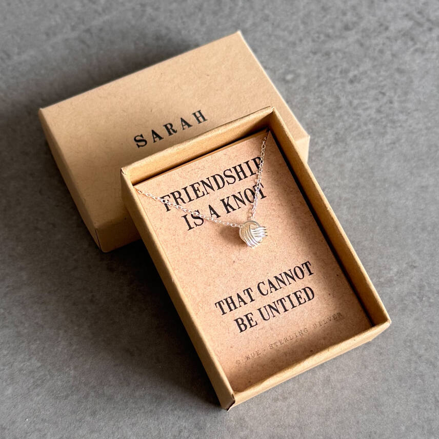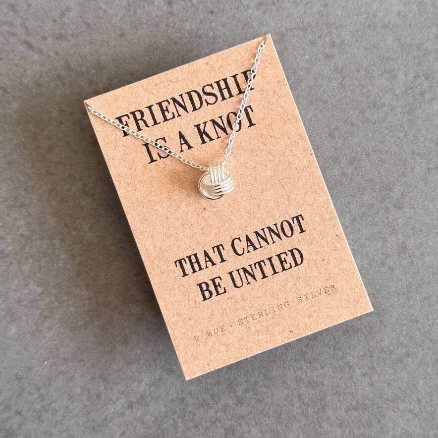 Wue's beautiful personalised silver necklace comes with a message card featuring the saying "Friendship is a knot that cannot be untied."
