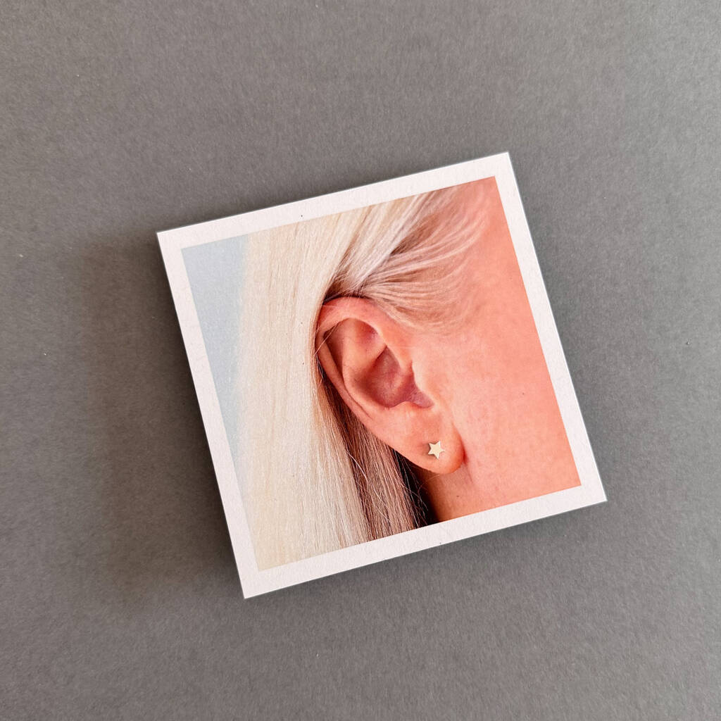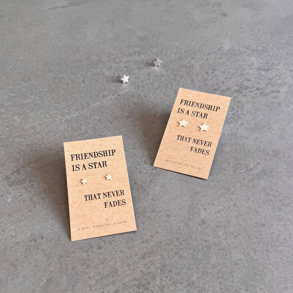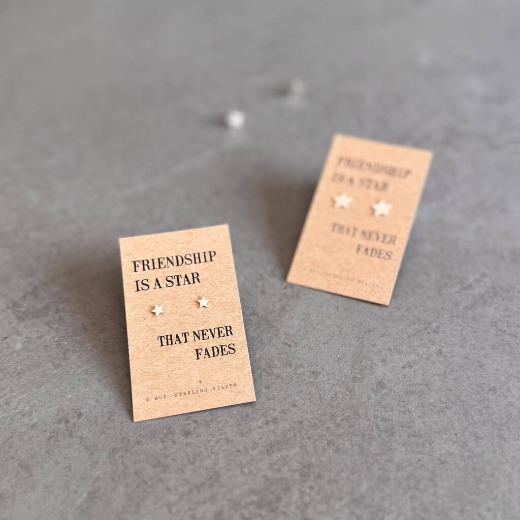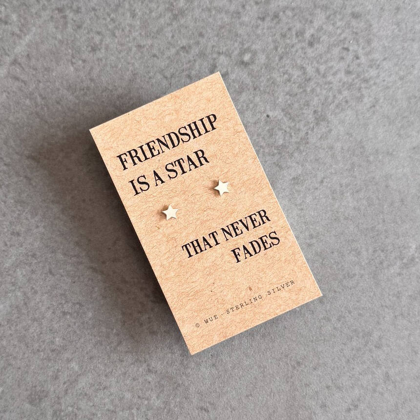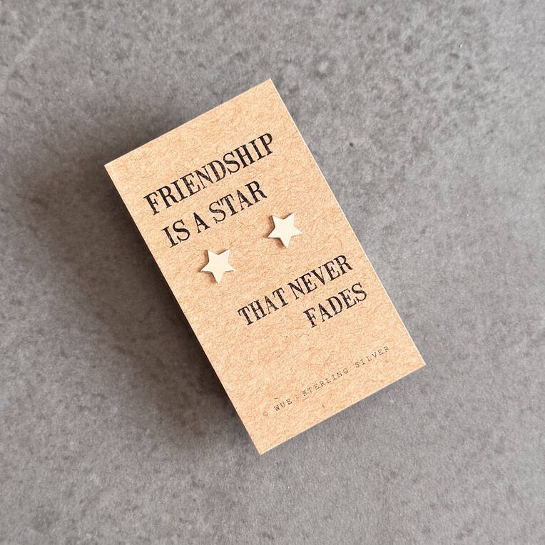 Friendship star sterling silver earrings with a little message card from Wue's token earrings range.
