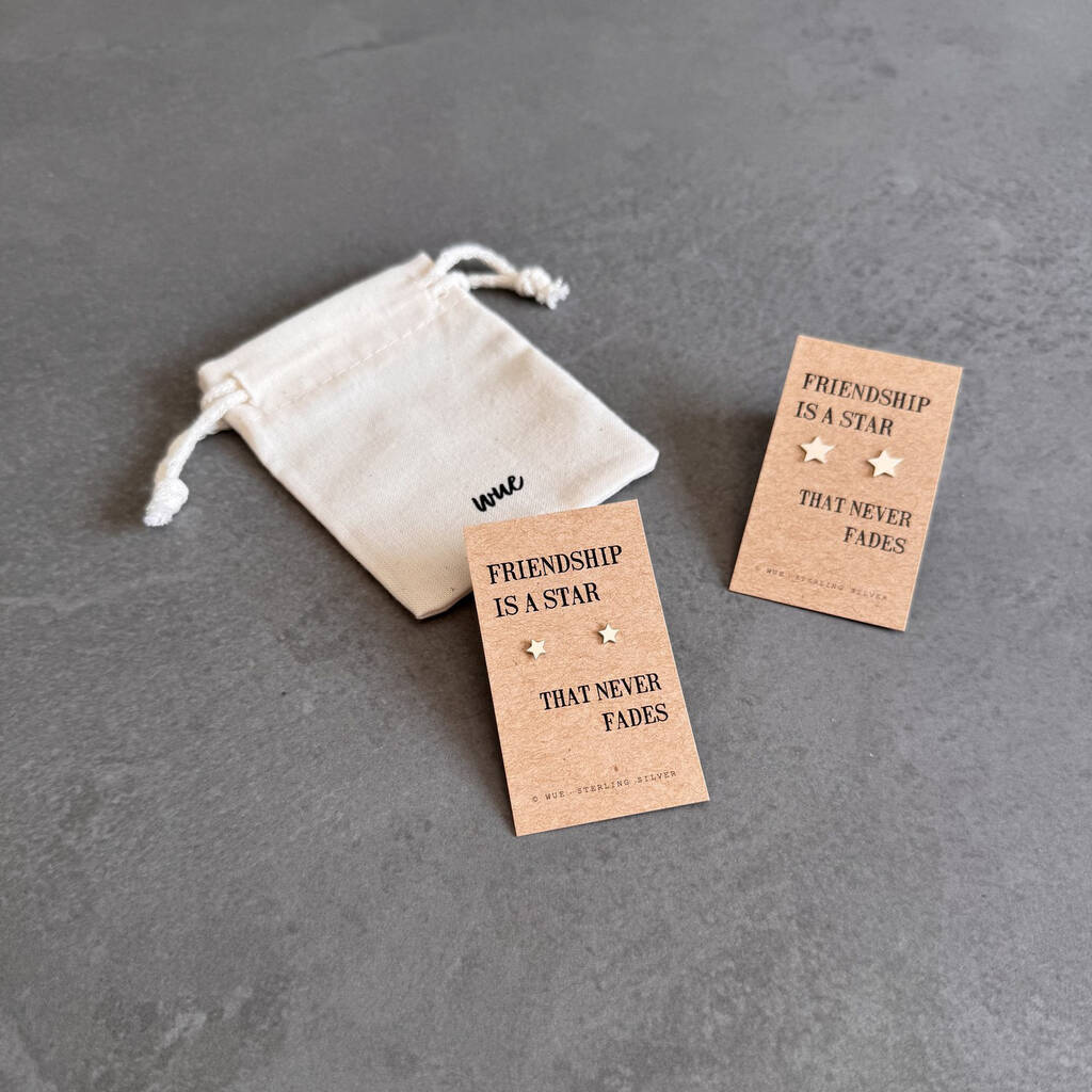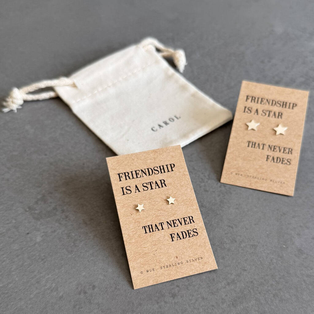 Silver star stud earrings on a "Friendship is a star" message card with a cotton gift bag that can be personalised.