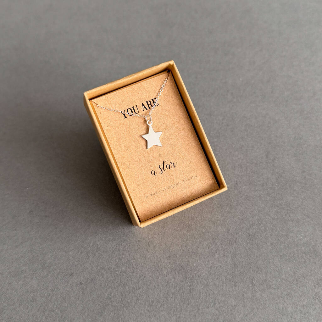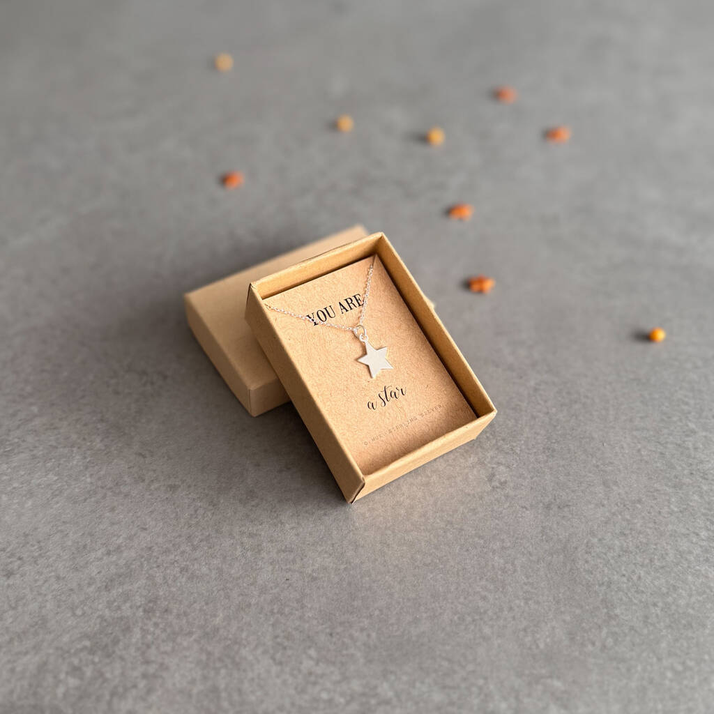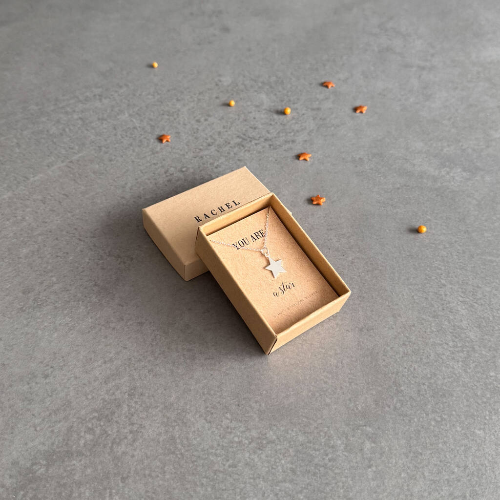 Each necklace is presented on a "You are a star" message card and in a gift box that can be personalised. Our gift box can be hand-stamped with the recipient’s name (up to 10 characters including spacing), and are the perfect finishing touch for sending to a friend, sister, mum, teacher, colleague and so many more.