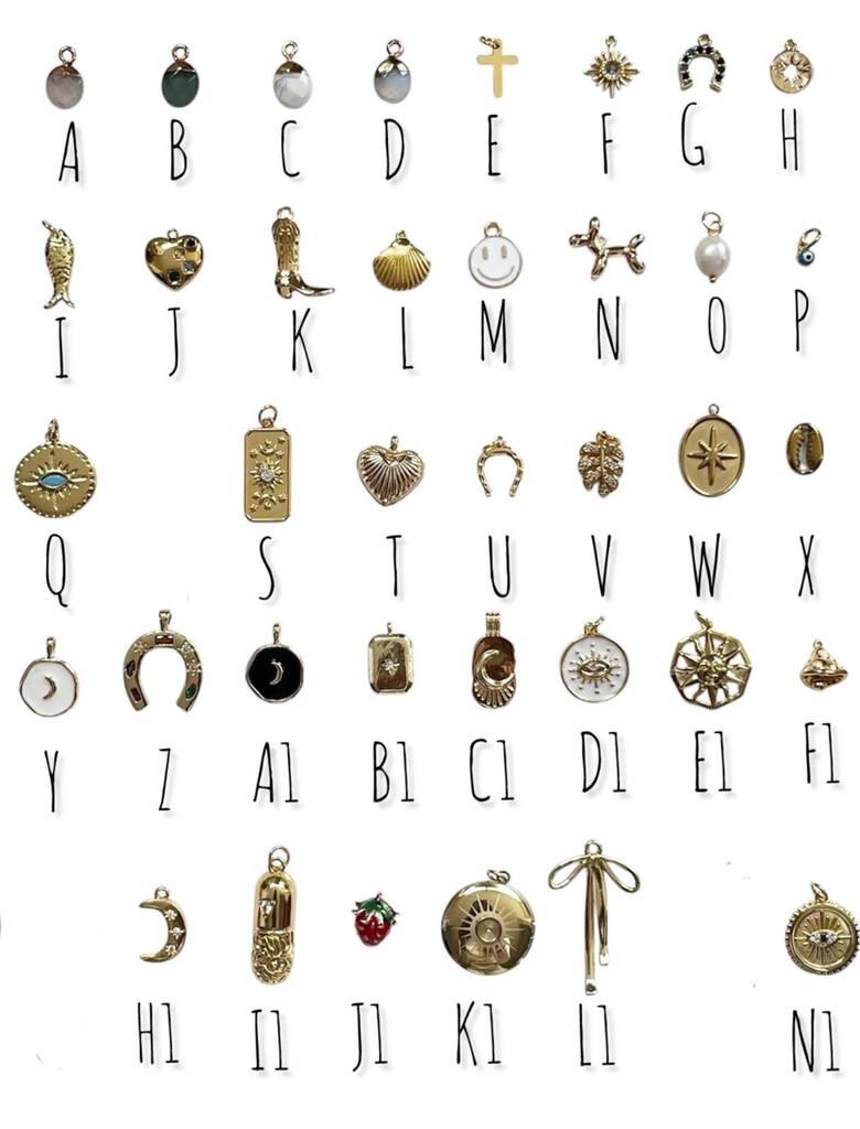 A - Rose Quartz | B - Aventurine | C - Howlite | D - Opalite | E - Faith Cross | F - Cubic Zirconia Star |G - Rainbow Stone Horseshoe | H- Midcentury Star | I - Lucky Fish | J - Candy Stone Heart | K - Cowboy Boot | L - Seashell | M - Smiley Face | N - Balloon Dog | O - Freshwater Raw Pill | P - Dainty Evil Eye | Q - Turquoise Talisman | R - Angel Wings | U - Lucku Horseshoe | V - Guiding Star | X - Cowrie Shell | Y - Black Luna | Z - Candy Stone Horseshoe | A2 - Black Luna | B2 - Vintage Star Bar | C2 - Crescent Tarot Card | D2 - Boho Talisman | E2 - 90S Sun | F2 - Mushroom | G2 - Vintage Coin | H2 - Cubic Zirconia Crescent | I2 - Chill Pill | J2 - Strawberry | K2 - Sundial Locket | E2 - Pretty As A Bow | M2 - Statement Luna | N2 - Midcentury Talisman