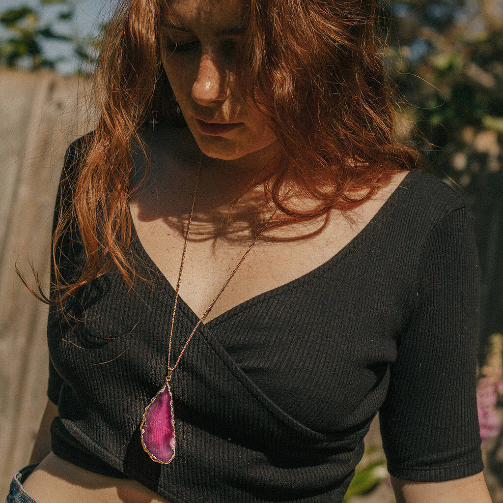 Gold Plate Pink Agate Crystal Long Length Necklace