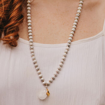 Howlite Crystal Longer Length Necklace With Gold Tone Ginkgo Leaf