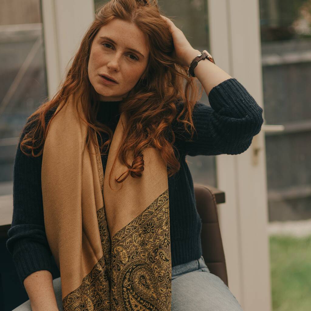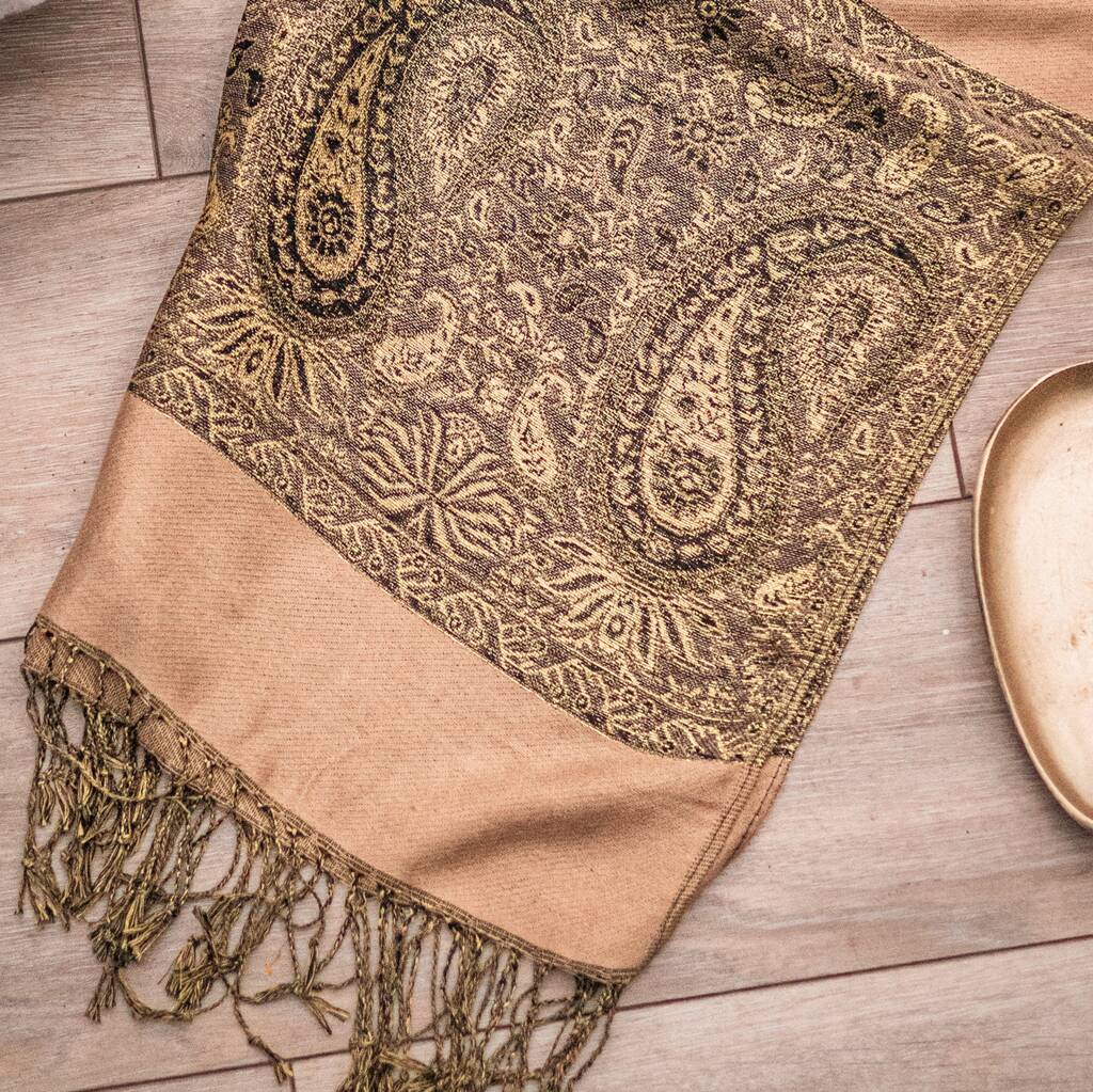 Luxurious Gold Paisley Border Pashmina With Tassels