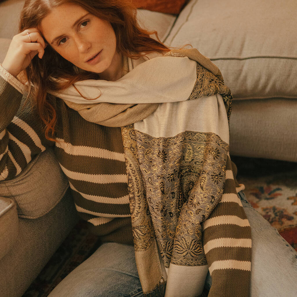 Soft Cream Paisley Border Pashmina With Tassels