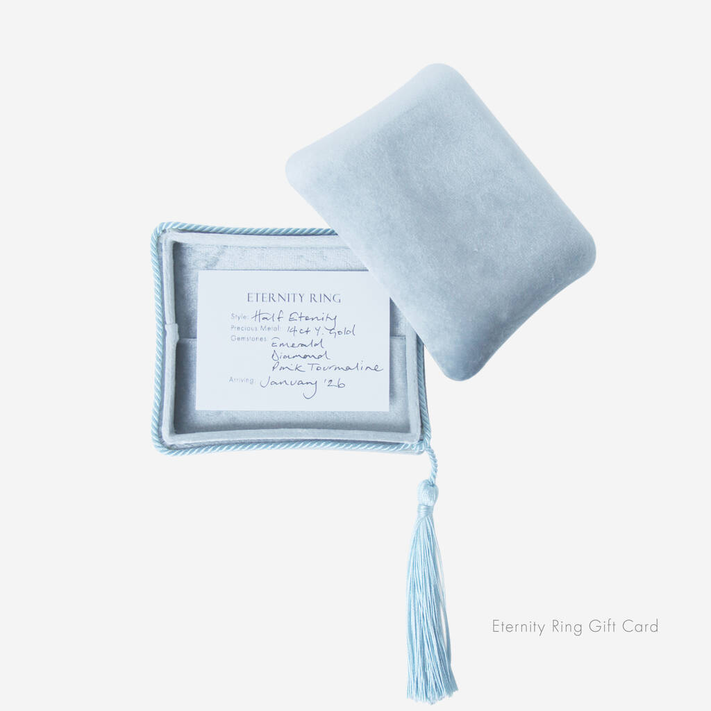 Unfortunately, we’re not able to make any more rings for Christmas delivery, but if you’d still like to gift an eternity ring for Christmas we’re able to send you Eternity Ring Gift Card, that will have all your ring details listed and space for you to write a message, it will come packaged in one of our beautiful velvet jewellery cases, that’s perfect for storing that extra special piece of jewellery. So, you’ll be able to have something to gift on Christmas day and we’ll make a start on your ring and have it ready for a January delivery.