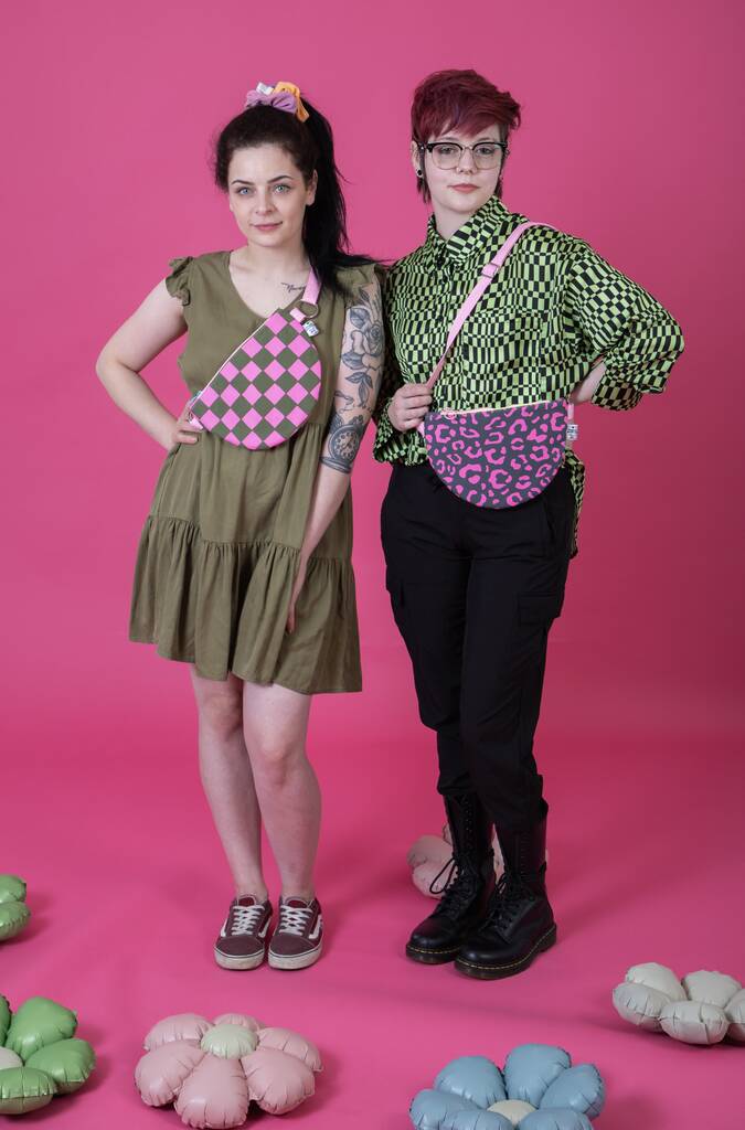 Waxed Canvas Crossbody Bag Pink Checkered Pattern On Green