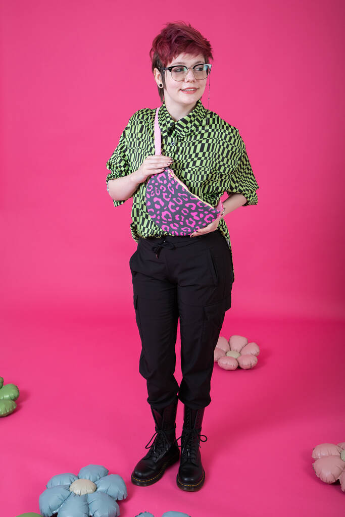 Waxed Cotton Cross Body Bag Pink Leopard Print On Grey