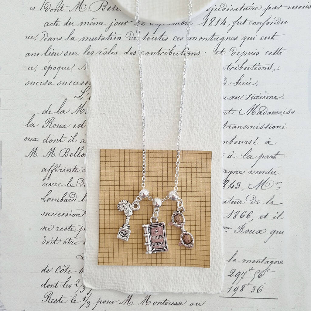 This delicate necklace features a storybook, inkwell, and glasses charm, perfect for any bookworm. It makes an excellent gift for a student or writer.